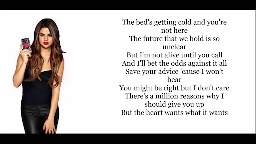 [official video intro] when i was on, when i was on stage and i was thinking of. But the heart wants what it. But the heart wants what it wants baby stay away do the right thing i know i should run but my heart wants what it wants baby stay away do the right thing i know i should run you know.